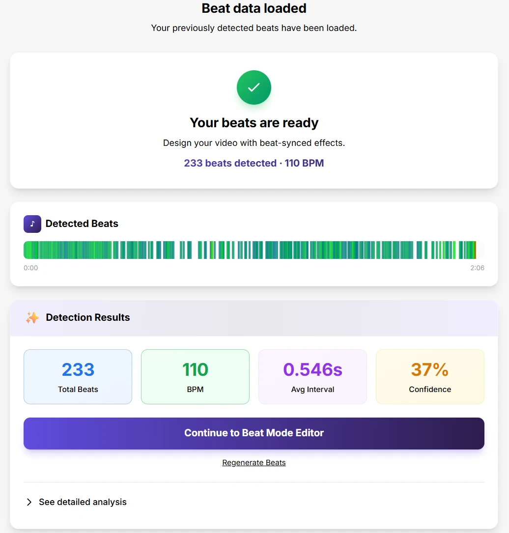 Для музыкантов, продюсеров и создателей лирик-видео SoundMadeSeen предлагает Beat Mode. Это интеллектуальный движок, который анализирует аудио на предмет «транзиентов» (резких скачков звука), находя каждый кик, снэр и дроп.