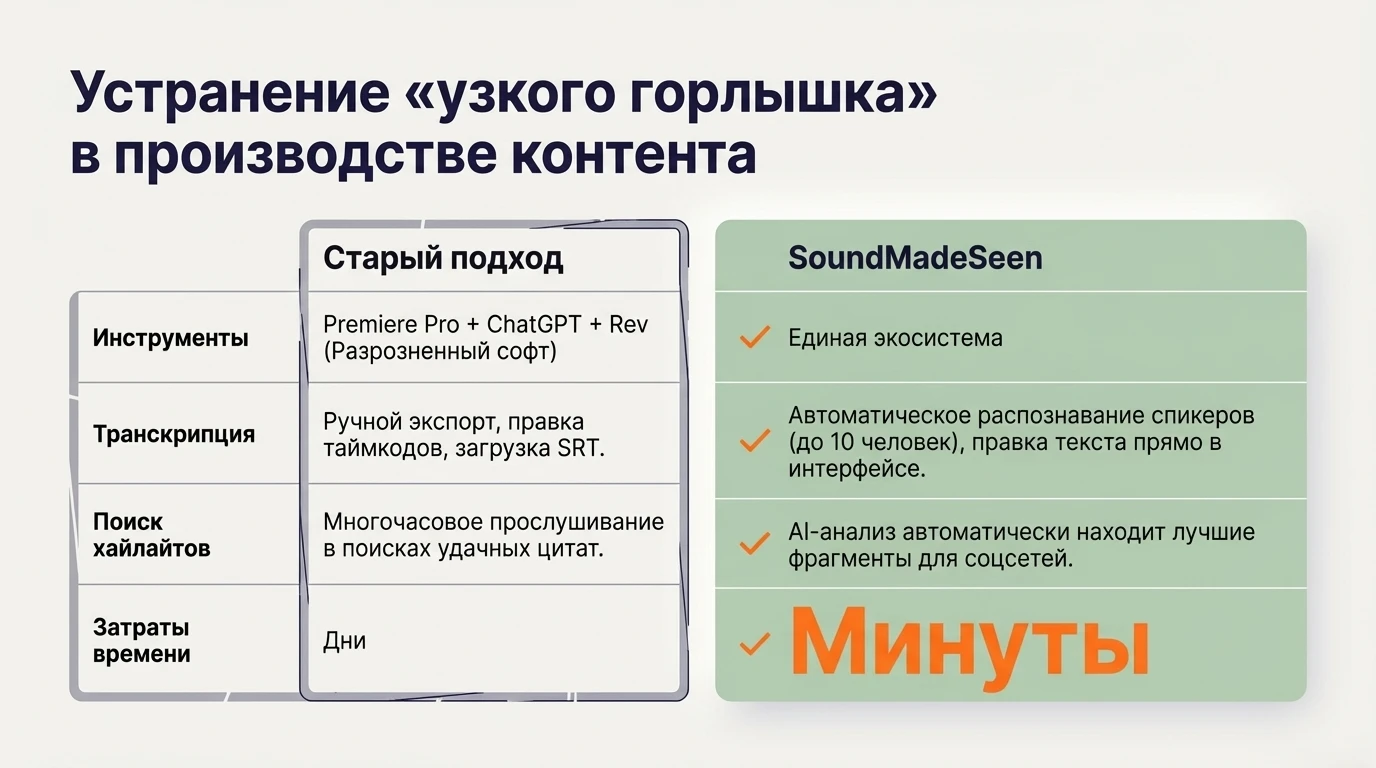 Если вам нужны качественные podcast clips, точная audio transcription и профессиональная ai video generation без лишних затрат времени, SoundMadeSeen — лучший выбор.