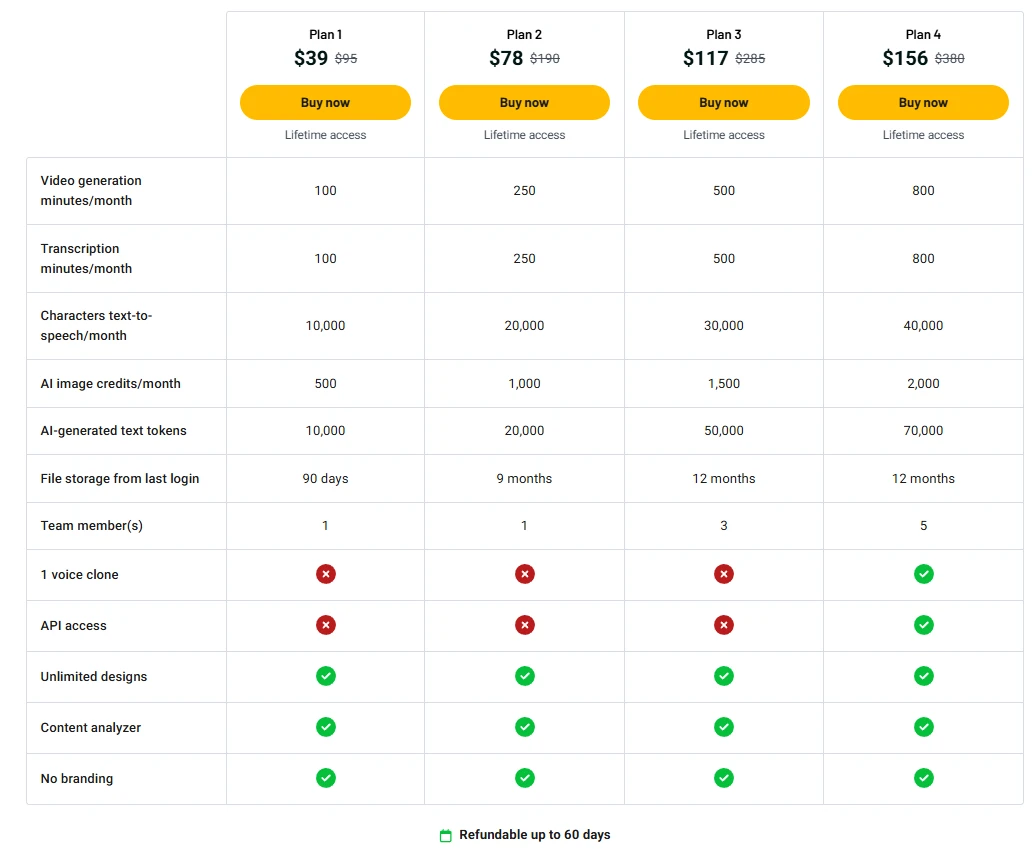 Я приобрел максимальную лицензию за $156, которая дает доступ ко всем функциям и щедрые ежемесячные кредиты за вполне демократичную единоразовую оплату. Если ваша задача — просто делать 2-3 видео в месяц, вам хватит и Tier 1 за $39.