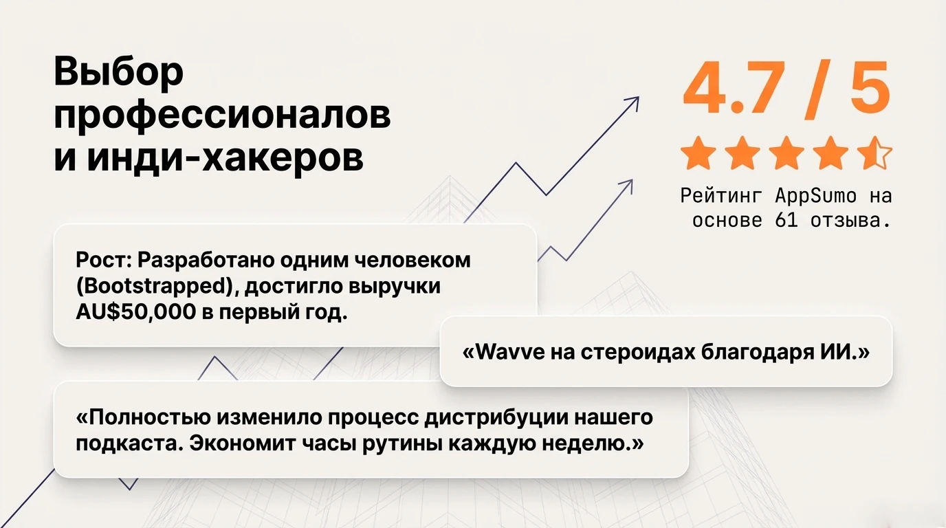 Реальные пользователи в целом очень высоко оценивают платформу SoundMadeSeen. На площадке AppSumo сервис имеет впечатляющий рейтинг 4.7 из 5 на основе 61 отзыва (из них 52 отзыва с максимальной оценкой).