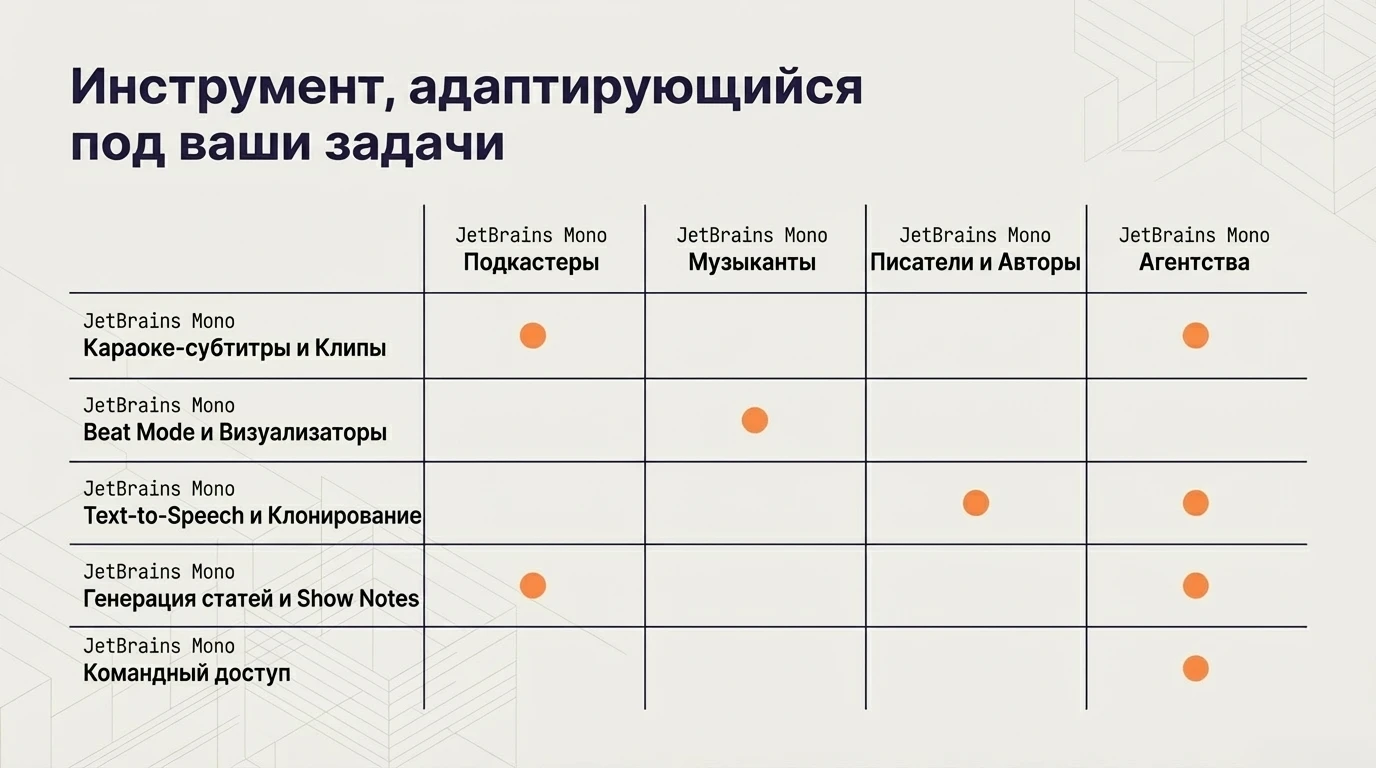 - Подкастеры: масштабирование через podcast clips для Shorts/TikTok и автоматизация шоу-ноутов.