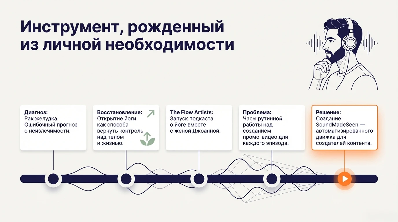 Используя свой опыт создания VOD-платформ и систем обработки видео, Рейн создал SoundMadeSeen — инструмент, который автоматизирует рутину, позволяя авторам сосредоточиться на главном: сторителлинге. Сегодня платформа превращает голос в полноценные мультимедийные активы, объединяя три столпа современного ИИ-контента: голос, изображение и ритм.