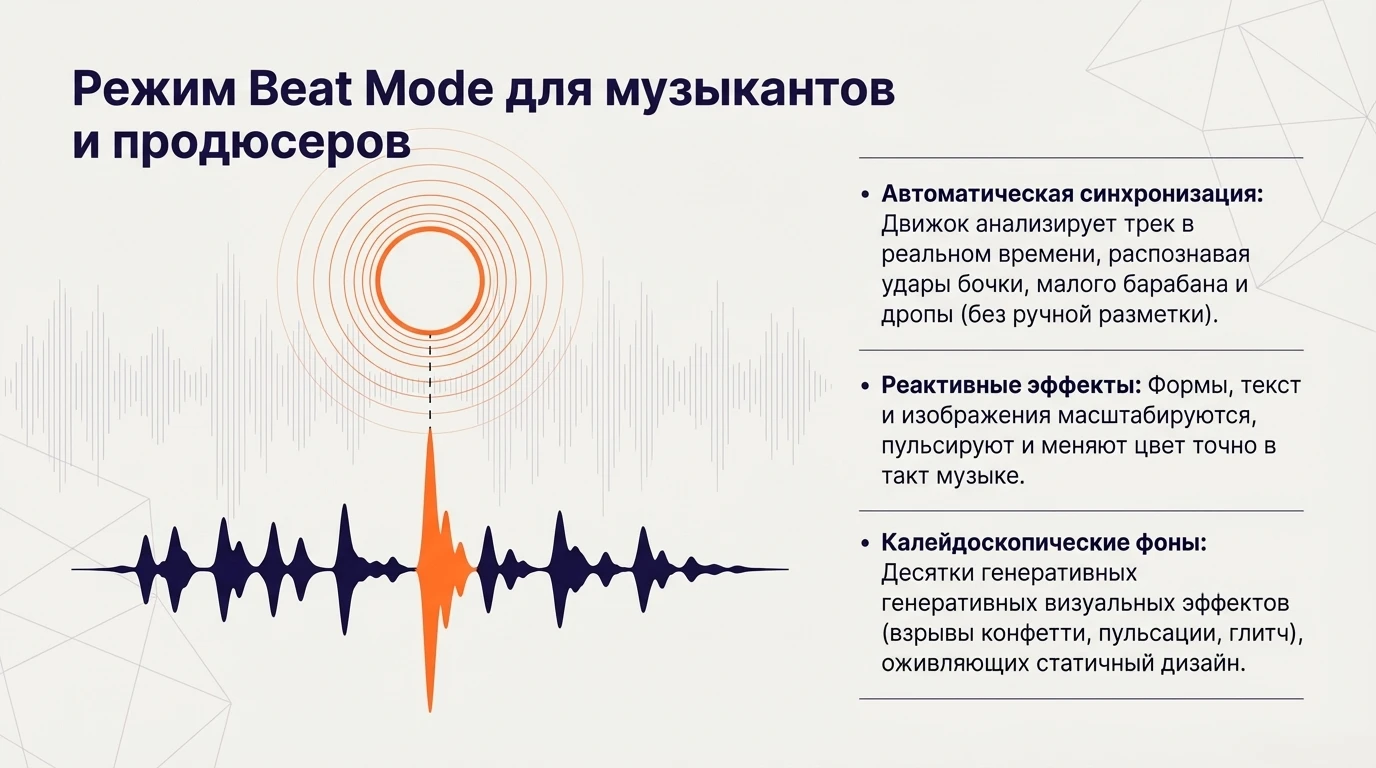 - Реактивность: элементы дизайна (текст, фигуры) могут пульсировать, увеличиваться или менять цвет строго в такт музыке без ручной настройки.